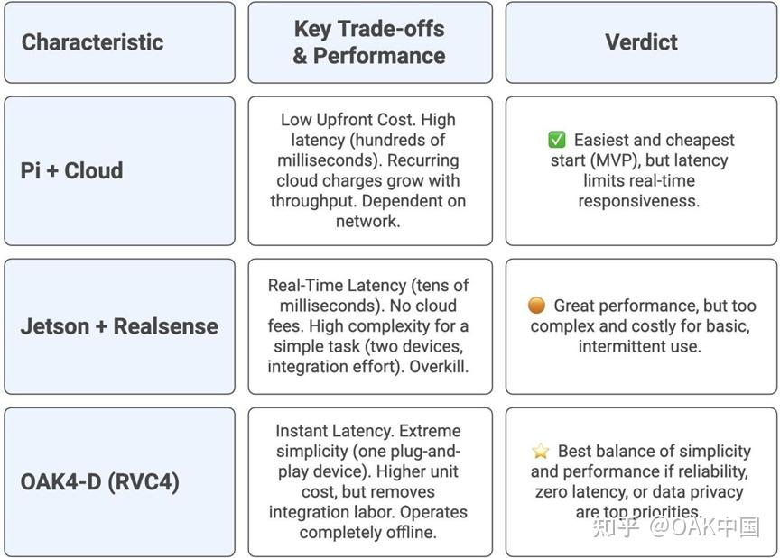 🟢 微型计算机(树莓派) + 云:只有当您需要一次性原型或非关键、低容量任务的最低前期硬件成本时,才推荐考虑考虑微型计算机(树莓派)+ 云的技术方案,因为延迟、可靠性和长期运营成本并非您当前考虑的关键因素。